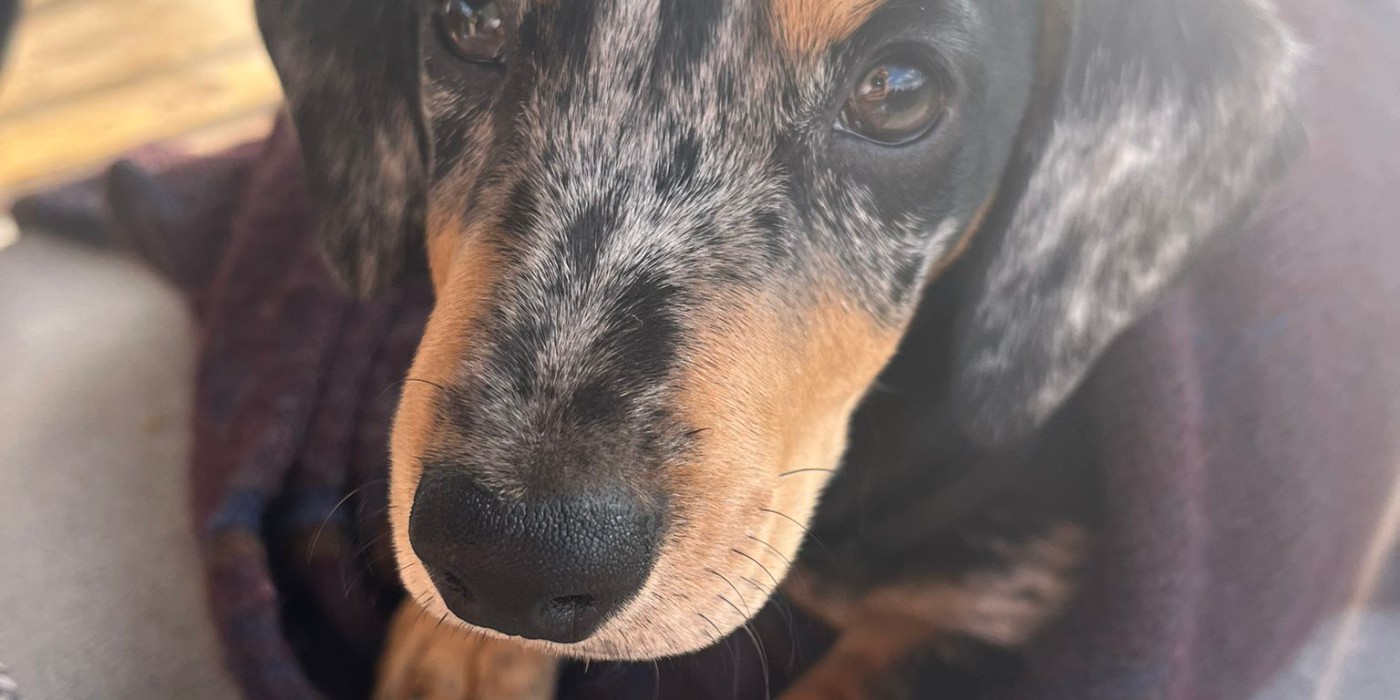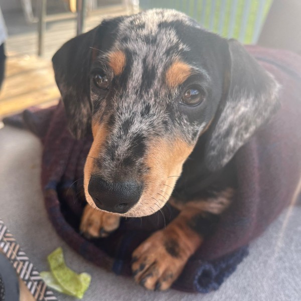 Zwart met witte vlekken en bruin aan kop, poten en borst